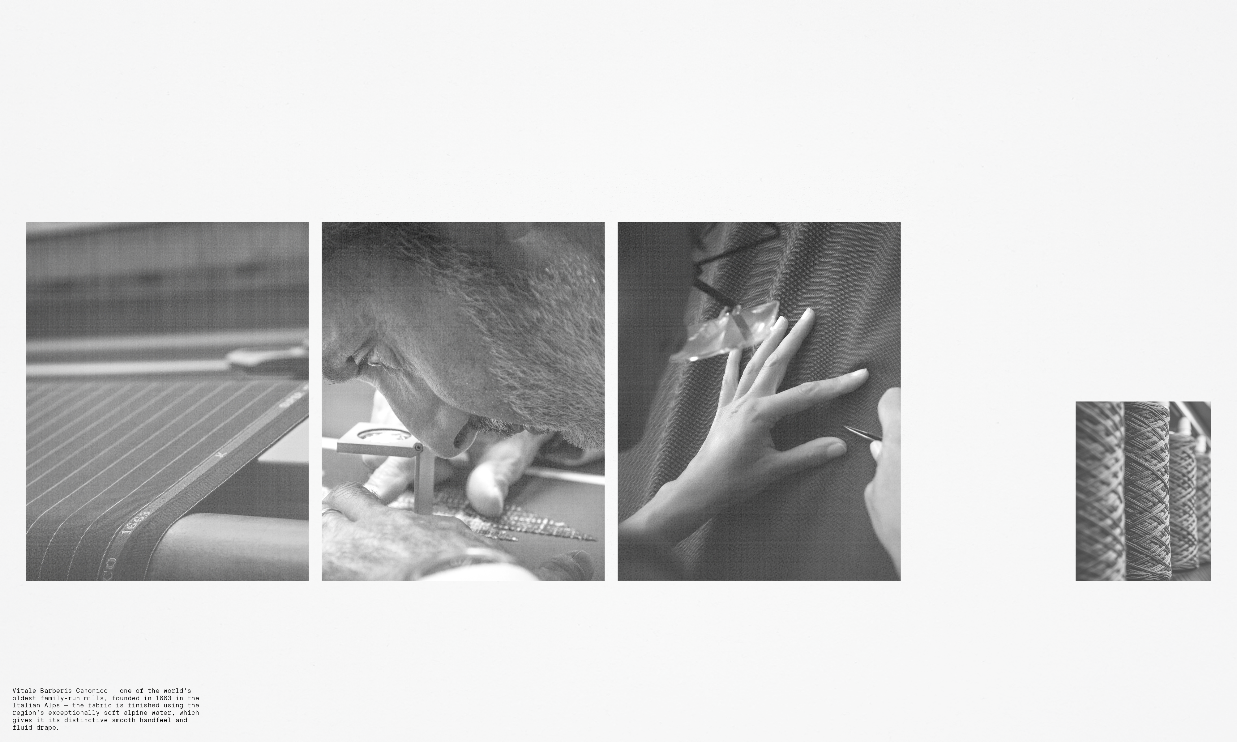 Woven by Vitale Barberis Canonico — one of the world’s oldest family-run mills, founded in 1663 in the Italian Alps — the fabric is finished using the region’s exceptionally soft alpine water, which gives it its distinctive smooth handfeel and fluid drape. Its natural stretch performance ensures freedom of movement while maintaining a sharp, composed silhouette.